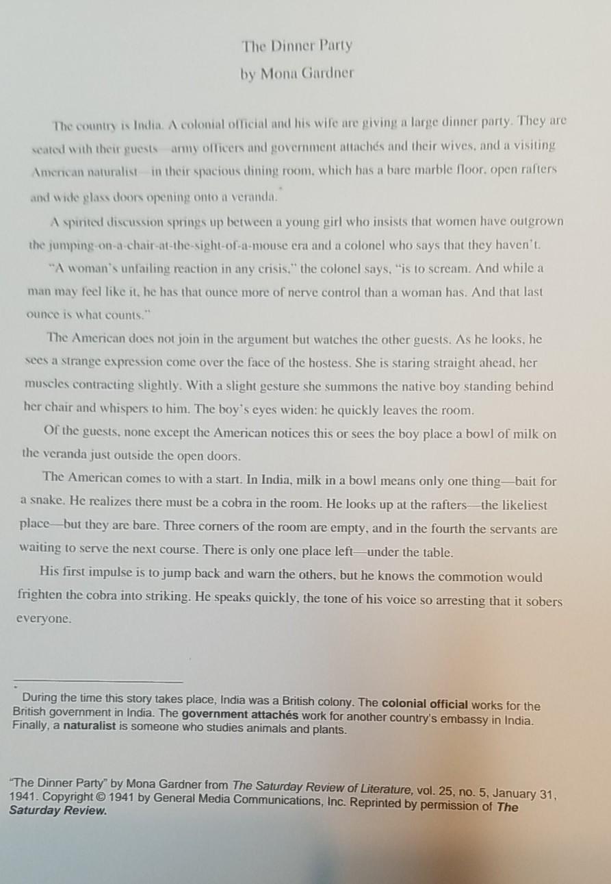 The dinner party by mona gardner 1 the country is india. Mona gardner the dinner party analysis. A colonial official and his wife are giving a large dinner party. An american naturalist who is at the party is watching the argument and sees the hostess, who is acting strangely, gesture for a bowl of milk to be put outside the door. The dinner party by mona gardner 1 the country is india.